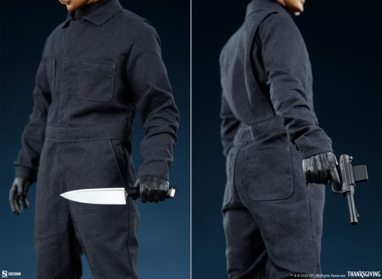 "No one appreciates subtlety anymore. To go viral, you really need to hit people over the head." We hope you brought your appetite - Sideshow presents the John Carver Sixth Scale Figure. This killer horror collectible pays tribute to the main dish of the holiday horror film Thanksgiving (2023). You dont need to wait until Black Friday to start slashing when John Carver steps in to deliver a lesson in being thankful - for your life! This horror movie figure is fully articulated and comes stuffed with more accessories than a trussed-up turkey so you can really play with your food. Dressed in a black jumpsuit and undershirt, the mysterious masked killer comes with two John Carver faces that magnetize to the figure: one traditional mask and one melted from slaving over a hot stove to prepare his Thanksgiving feast. He also wears a magnetized pilgrim hat and sculpted boots to complete his simple yet sinister look. Add his optional turkey apron and microphone headset for extra festive flair from the films climax. Of course, what would holiday dinner be without all the fixings? The John Carver Sixth Scale Figure features a collection of killer kitchen tools for preparing a buffet of carnage. Pick between a pitchfork, an axe, a meat tenderizer, a carving knife, and a tranquilizer gun for doling out servings of danger at the dinner table. Then, dont forget to raise a toast to all the sacrifice that went into preparing your meal with a goblet full of victim Amy's blood and a fork loaded up with Kathleens cooked flesh. Not so hungry? But the skin is the best part! The John Carver Sixth Scale Figure also includes a total of seven sculpted, gloved hands for interacting with his numerous accessories: a pair of open hands, a pair of grip hands for the weapons, a right gesture hand, a right trigger hand for the tranquilizer, and a right hand for holding the goblet. No leftovers. Serve yourself up a slice of slasher horror with the John Carver Sixth Scale Figure by Sideshow today.