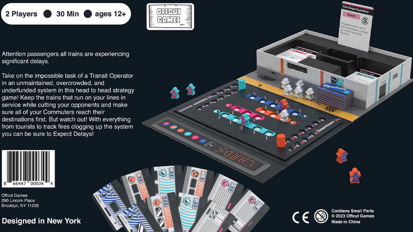 Expect Delays is a 2-player head-to-head hand management game that plunges you into the chaos of an unmaintained, overcrowded, and underfunded subway system. Use your actions to strategically manage a shared deck of subway cars. Keep your commuters’ lines running, while taking your opponent’s out of service. Avoid pesky tourists and watch out for the rapidly changing Service Advisories. With everything from held doors to track fires, you can be sure to expect delays! Be the player to earn the most Destination Points before the trains grind to a halt and your commute is permanently delayed!