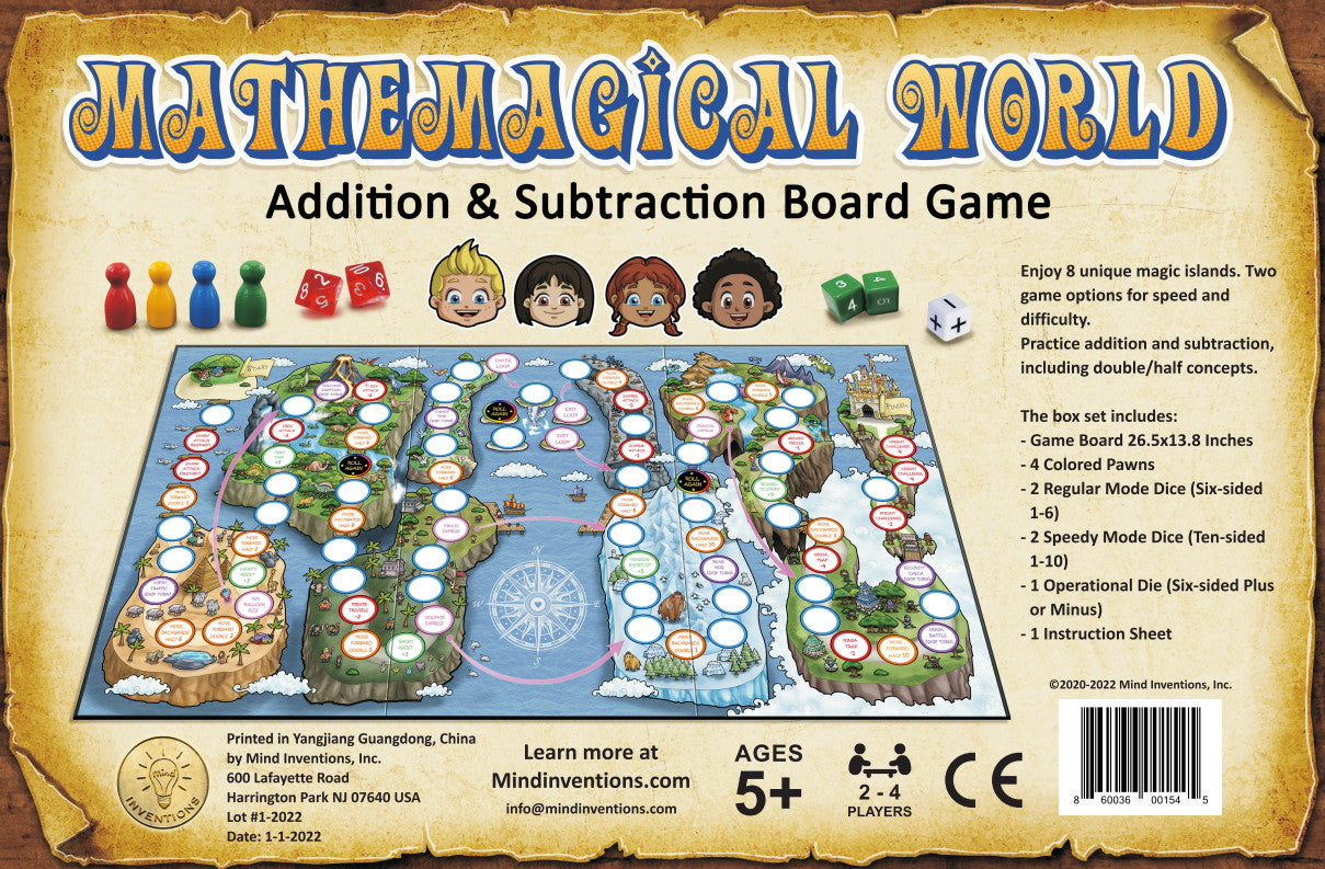 Mathemagical World is an Addition & Subtraction Math Board Game for Kids ages 5+. It is a fun way to practice math, at home or at school and takes just seconds to master and can be played from minutes to hours! Learn math concepts of addition, subtraction, doubling and halfing all while you practice critical thinking. Loved by kids, approved by parents and recommended by teachers!