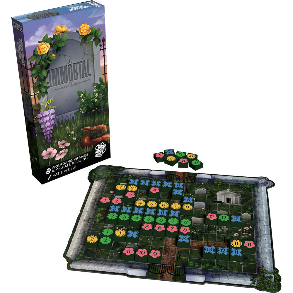 In Immortal, players will take turns adding Flower tiles to their available flowers or placing them in rows or columns on the Cemetery board. Lines of Flowers must be either sequential numbers or the same number, but different colors. The player who places all their Flowers first is the winner!