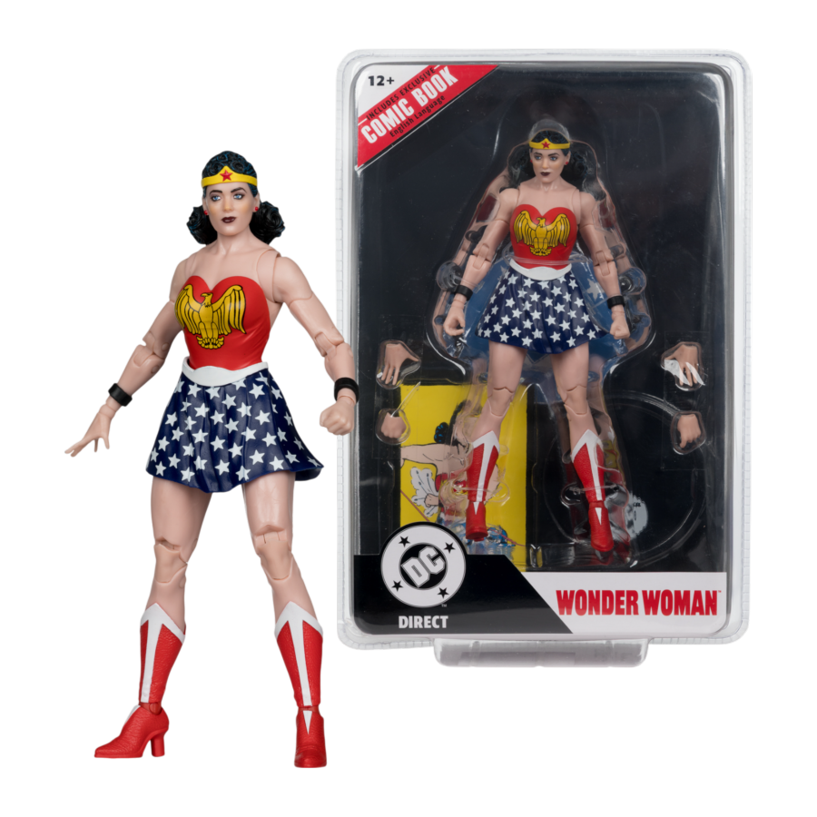 The origin of Wonder Woman continues from ALL STAR COMICS #8! The Amazon Princess arrives in Man's World with the wounded Steve Trevor. This story also explains the origin of Wonder Woman's secret identity of Diana Prince and features the first appearance of Wonder Woman's Invisible Jet! Features: - Wonder Woman is based on her look from the Wonder Woman #1 comic - Incredibly detailed 7" scale figure, designed with Ultra Articulation with up to 22 moving parts for full range of posing and play - Accessories include 4 extra hands and base - Also includes English-only reprint Wonder Woman #1 comic book - Included collectible art card with character art on the front, and character biography on the back - Collect all McFarlane Toys x DC Direct Page Punchers figures