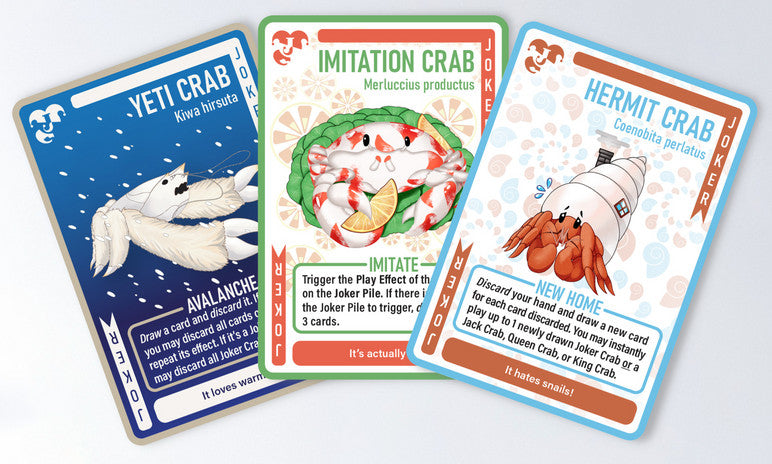 Joker Crabs, all based on real crab species, have unique effects. 21 of these cards may strategically benefit the player, by, for instance, forcing an opponent to draw from their hand or allowing them to play unique combos. One of the Joker Crabs--the Lobster--functions as a sort of barrier to victory, since it cannot be played. Players must find creative ways of discarding it without playing it.