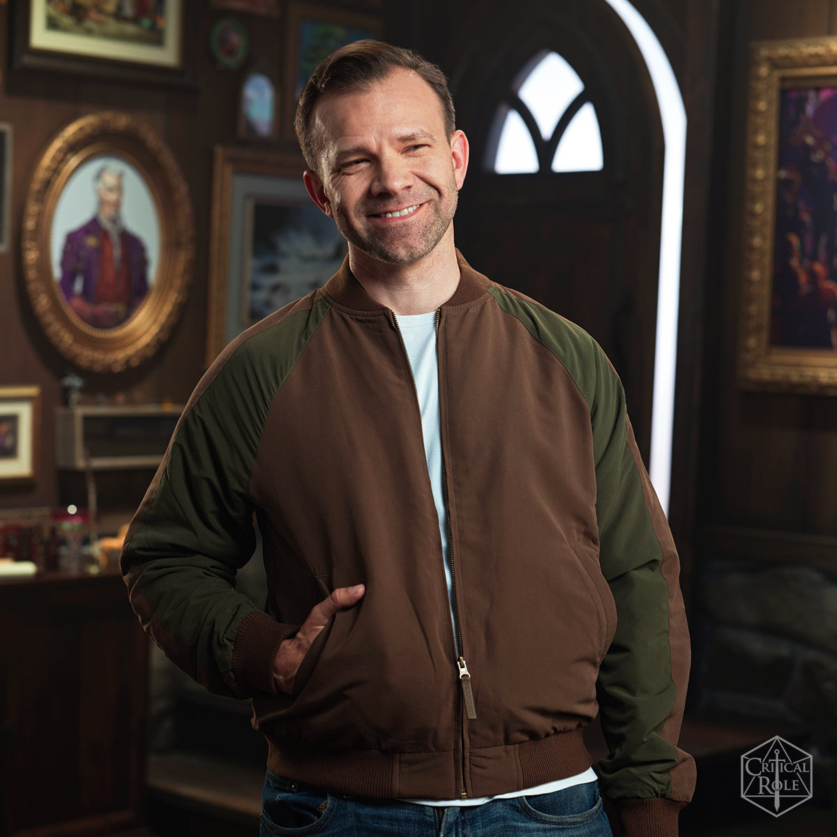 Be the most stylish halfling amongst the Crown Keepers in this effortlessly chic bomber jacket inspired by Orym of the Air Ashari. The block-toned olive green and brown outerwear piece features a ribbed collar and waistband, Critical Role logo zip-closure, side pockets, and a quilted inside lining of a step and repeat pattern of the engravings featured on Orym€™s sword and shield. To add a little razzle dazzle, the back of the jacket has a raised embroidered design of the Air Ashari style vines, clouds, and Cathus and Ruidus moons.