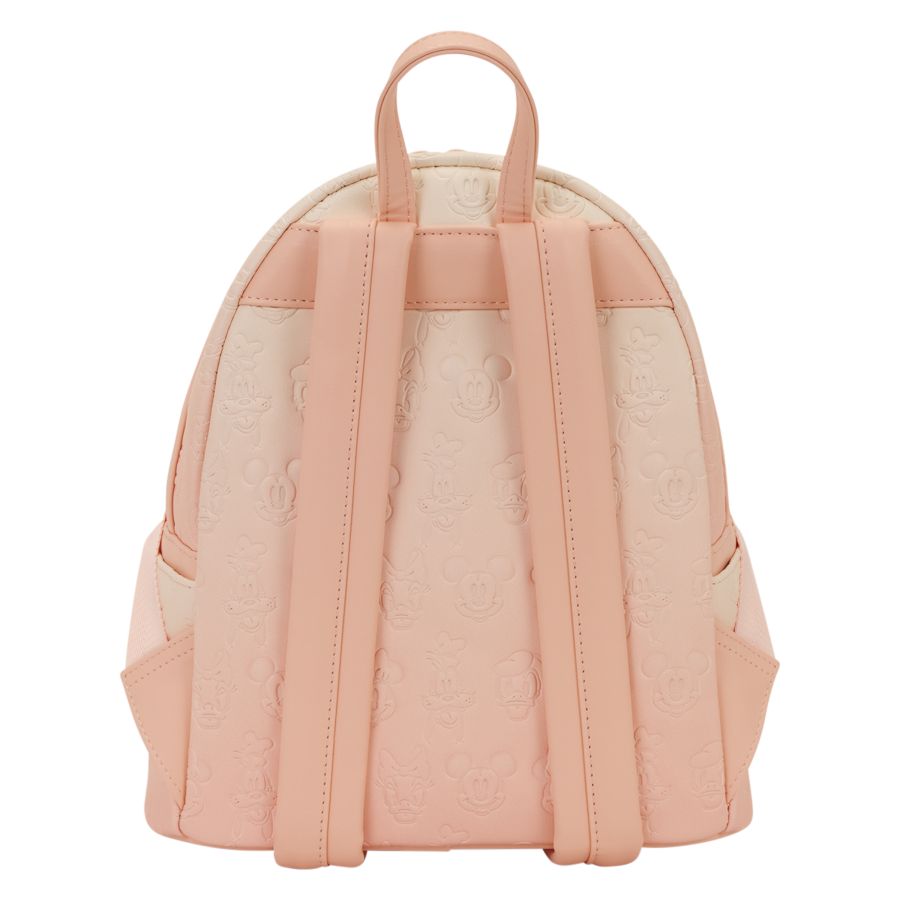 Super cute style with Disney's Mickey & Friends! This mini backpack features a pink ombre design with debossed details of Mickey Mouse and all his friends! You'll find a painted molded metal rivet of Mickey Mouse on the front pocket, which also features a flap with a super cute scalloped edge. Pink straps bring the whole look together! This is a fun style to show off your love for all things Disney! Features - Polyurethane - Sturdy top handle - Adjustable shoulder straps - Applique, debossed, molded metal rivet, and printed details - Coordinating interior lining Dimensions: - 9" W x 10" H x 4.5" D - 22.8cm W x 25.4cm H x 11.4cm D This is an officially licensed Disney product.