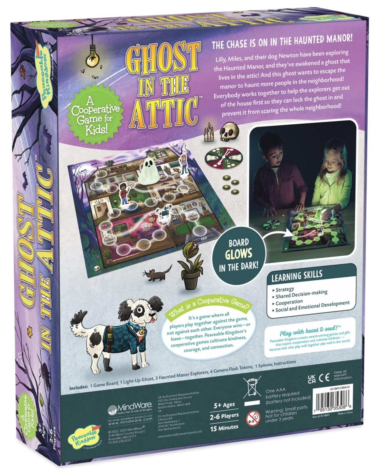 It’s lights out for this unique board game that you play in the dark! Featuring a glow-in-the-dark game board and light-up ghost mover, players work together in this cooperative game to escape the haunted manor and lock the ghost inside. This one-of-a-kind game is sure to become a family game night favorite! For 2 - 6 players ages 5 and up.